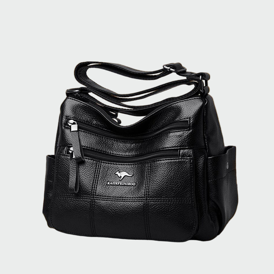 Praktikus fekete válltáska klasszikus és funkcionális dizájnnal. Számos külső cipzáras zseb található rajta, amelyek kényelmet nyújtanak a szükséges dolgok rendezésében és az azonnali hozzáférésben. Tartós anyaga és erős fogantyúi napi használatra alkalmasak, míg minimalista jellege bármilyen stílushoz illeszkedik. Ideális választás azok számára, akik stílust és praktikusságot keresnek egy táskában.